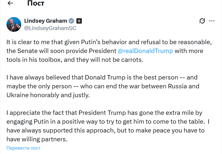 “З огляду на поведінку Путіна і його відмову бути розсудливим, Сенат скоро надасть президенту Дональду Трампу ще більше інструментів у його арсеналі – і це буде не пряник”, – заявив він.
