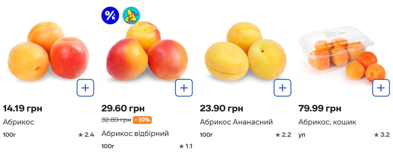 Вартість абрикосів у “Сільпо” (скриншот silpo.ua)
